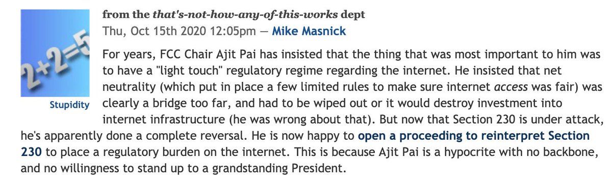 techdirt.com/articles/20201015/11555145508/blatant-hypocrite-ajit-pai-decides-to-move-forward-with-bogus-unconstitutional-rulemaking-section-230.shtml