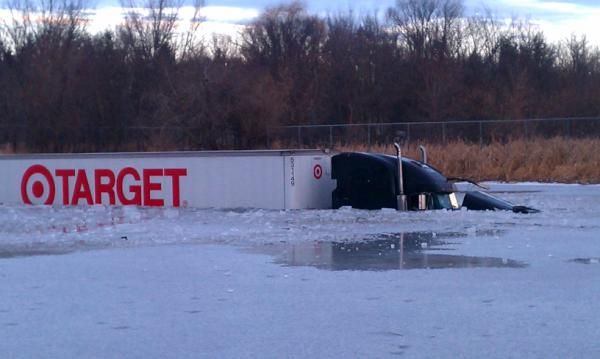 : Woah, photo of the day. Semi goes through pond ice of I-94 northwest of Twin Cities -np