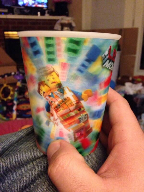 Drinking whiskey in a Lego movie cup because I packed the glassware today.