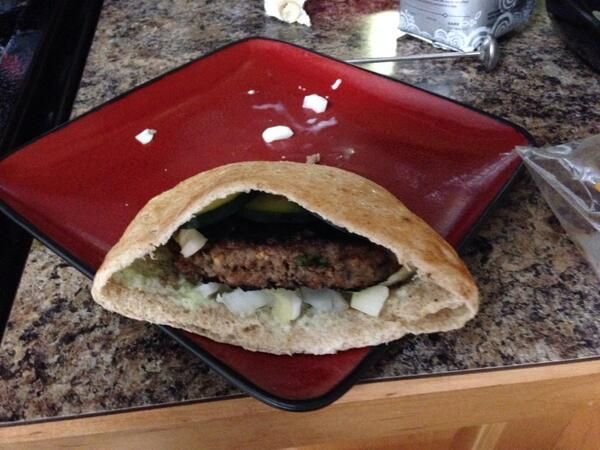 Greek-inspired lamb burgers on pita with homemade tzatziki. I think I went a little overboard on the herbs, but good.